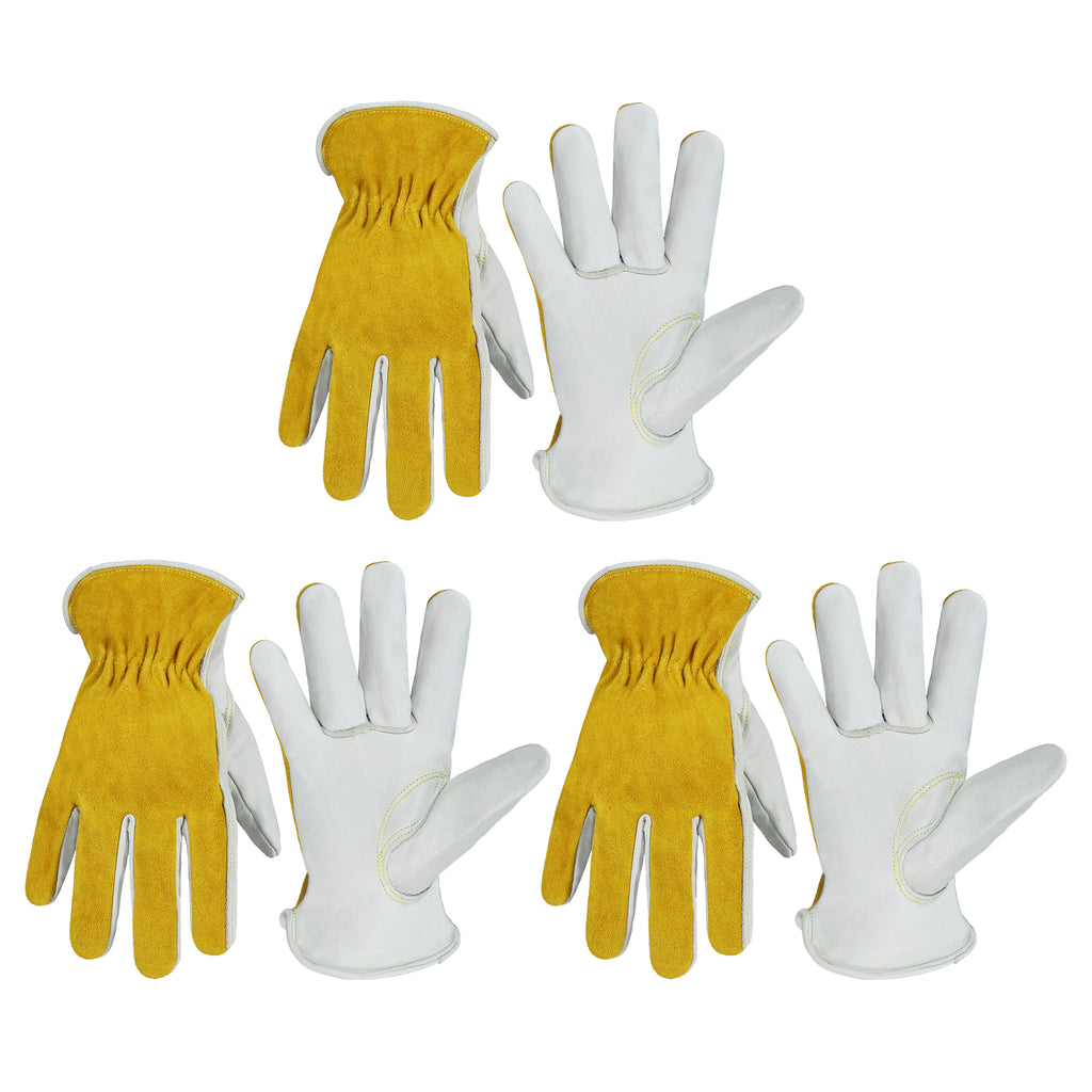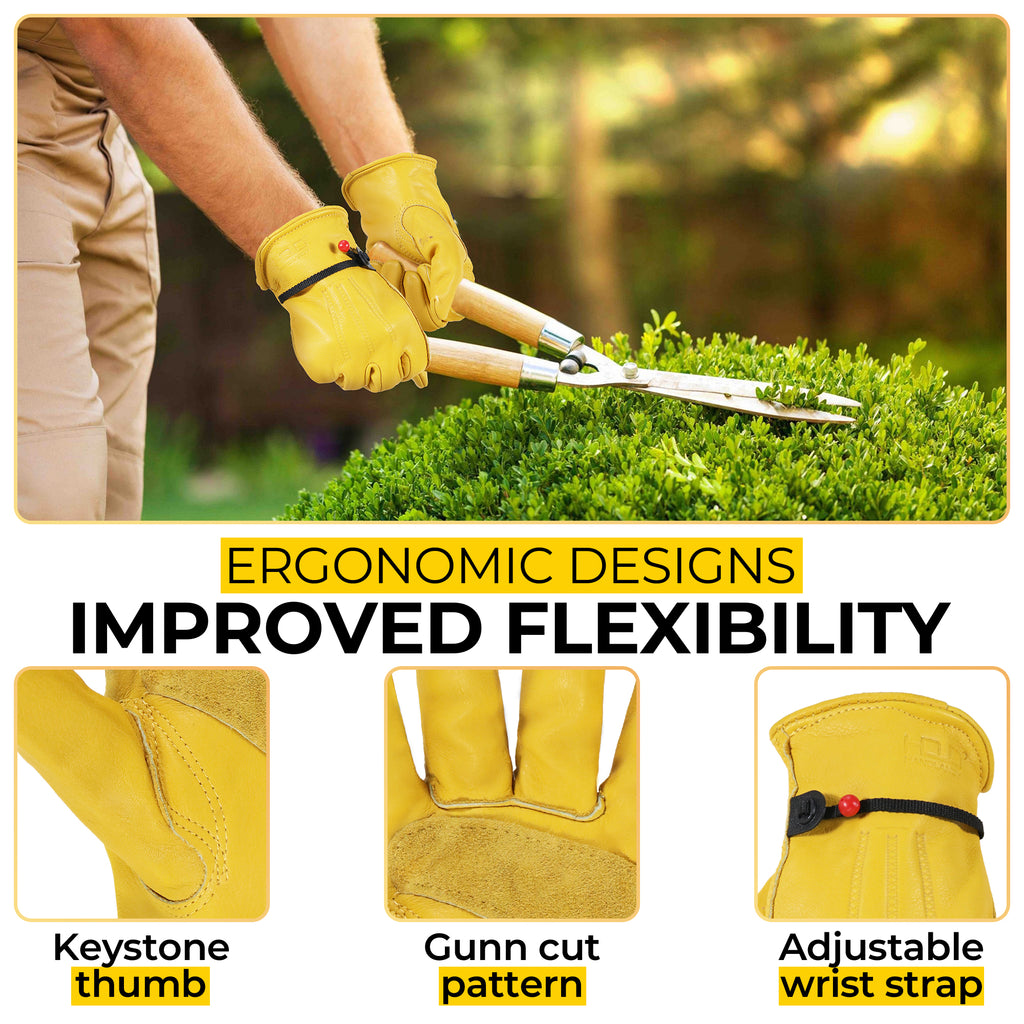 • Premium 100% Genuine Cowhide Leather Work Gloves with Reinforced Palm: Crafted from premium, abrasion-resistant cowhide leather, these work gloves feature reinforced palm patches for demanding tasks in construction, carpentry, and heavy yard work. Built to withstand intense use while keeping hands fully protected.
